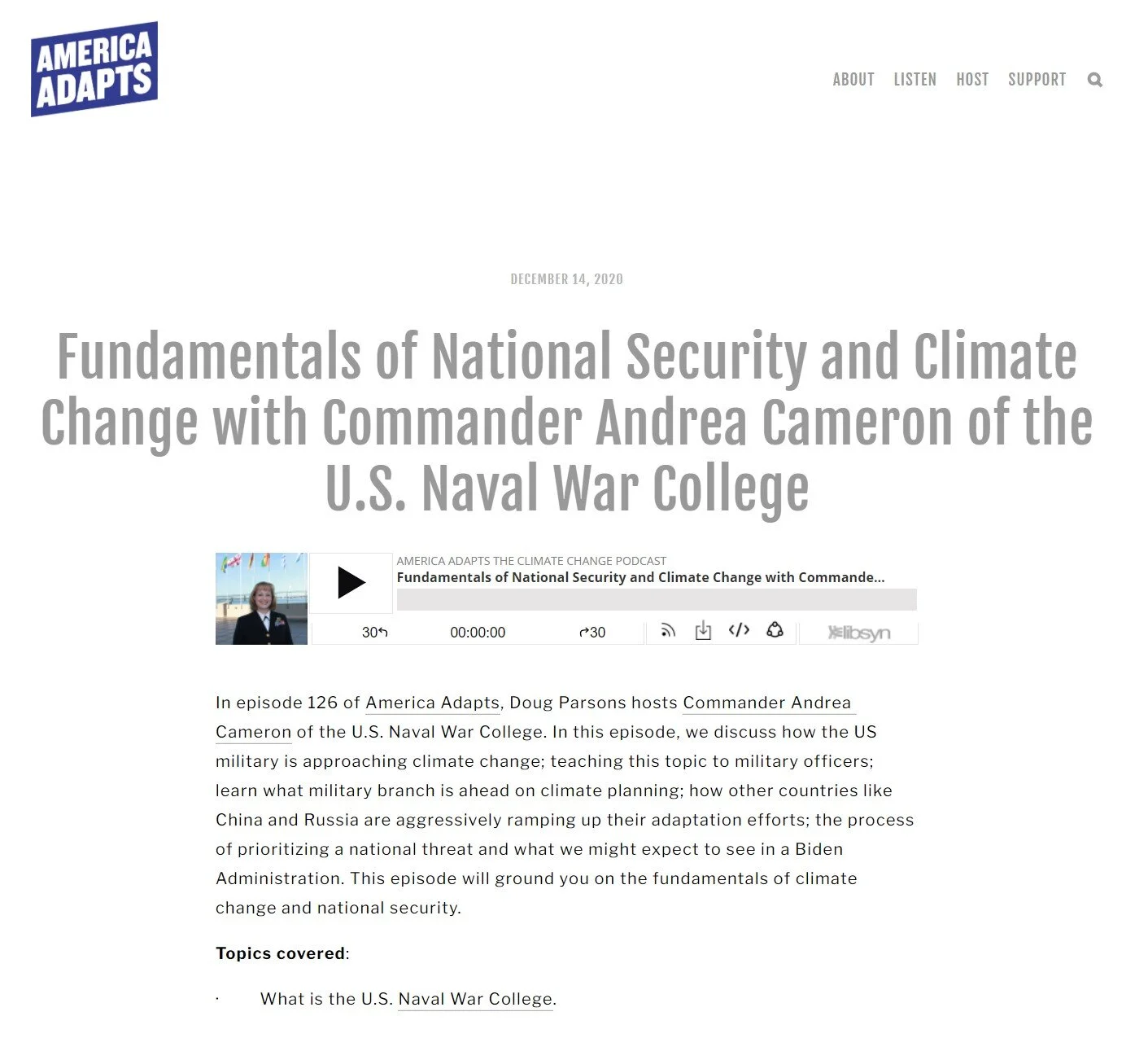 Andrea Cameron walks us through the upcoming conference on national security and the economic implications of climate change. She introduces us to the speakers, such as Hon. Alice Hill, and the topics of panel discussion, such as power competition, fragile states, defense budget, infrastructure, and US & international efforts to develop a ‘Blue Economy.